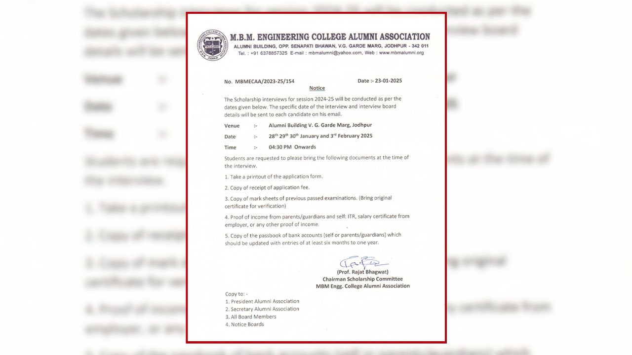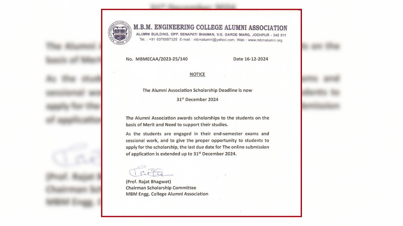 The Alumni Association strives to help needy and meritorious students of MBM Engineering college in their academic pursuits. Our Alumni generously contribute towards this cause.