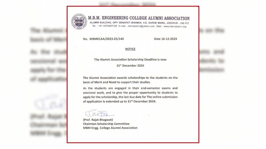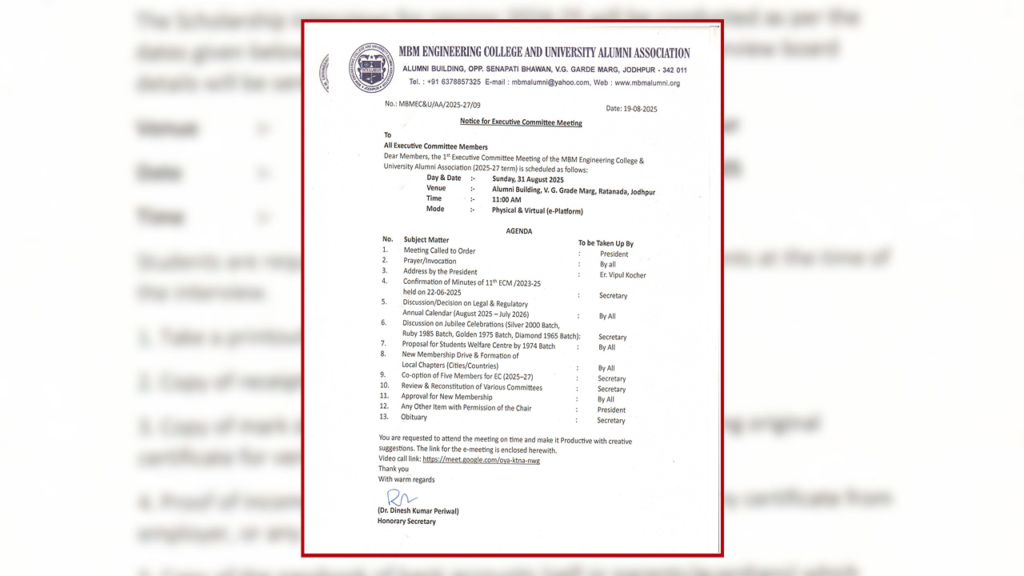 News Update Jodhpur The MBM Engineering College Alumni Association has announced the 6th Executive Committee Meeting for the 2023-25 term. The meeting is scheduled to take place on Sunday, July 21, 2024, at 11:00 AM. Members can attend the meeting in person at the Alumni Building on V.G. Grade Marg, Jodhpur, or join virtually through […]