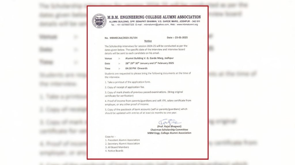 News Update Jodhpur The MBM Engineering College Alumni Association is set to hold its 47th Annual General Meeting (AGM) on Sunday, July 28, 2024. The meeting will commence at 11:00 AM at the association’s office building, opposite Senapati Bhawan on V.G. Garde Marg, Ratanada, Jodhpur. Additionally, the meeting will be accessible through a virtual platform […]