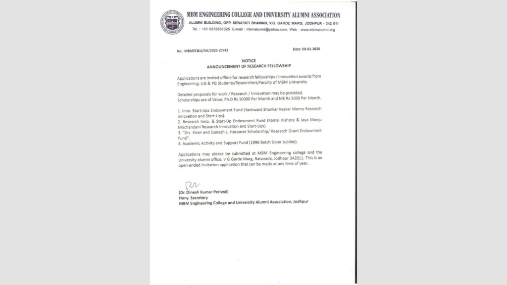 News Update No.: MBMEC&U/AA/2025-27/42 Date: 08-01-2026 NOTICEANNOUNCEMENT OF RESEARCH FELLOWSHIP Applications are invited offline for research fellowships / Innovation awards from Engineering: UG & PG Students/Researchers/Faculty of MBM University. Detailed proposals for work / Research / Innovation may be provided.Scholarships are of Value, Ph.D Rs 10000 Per Month and ME Rs 5000 Per Month. 1. […]