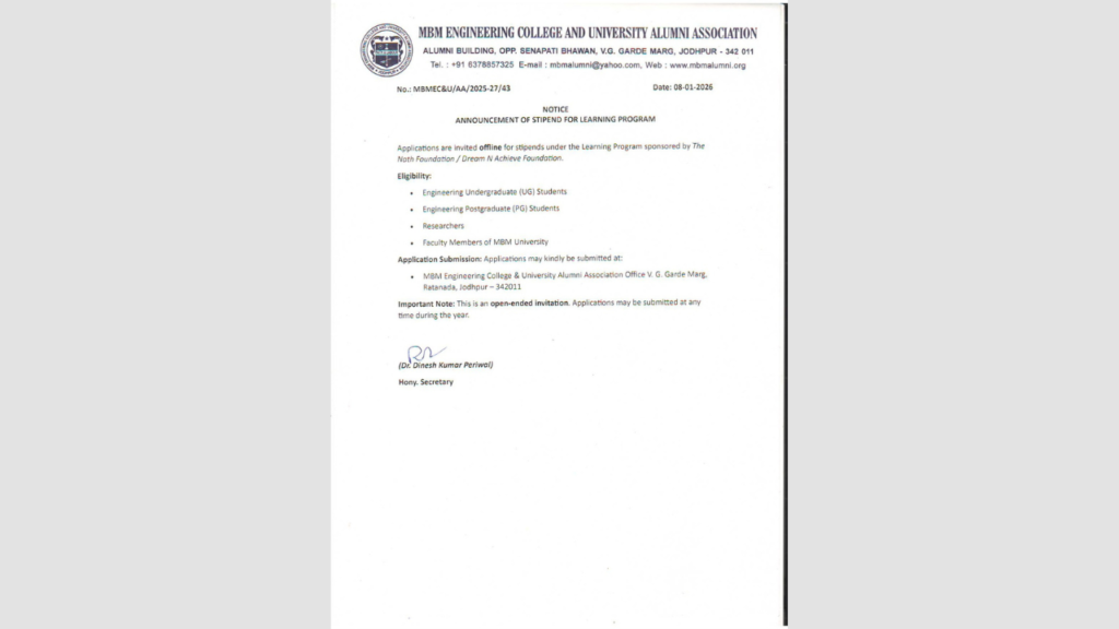 News Update No.: MBMEC&U/AA/2025-27/43 Date: 08-01-2026 NOTICEANNOUNCEMENT OF STIPEND FOR LEARNING PROGRAM Applications are invited offline for stipends under the Learning Program sponsored by The Nath Foundation / Dream N Achieve Foundation.Eligibility:• Engineering Undergraduate (UG) Students• Engineering Postgraduate (PG) Students• Researchers• Faculty Members of MBM UniversityApplication Submission: Applications may kindly be submitted at:• MBM Engineering […]