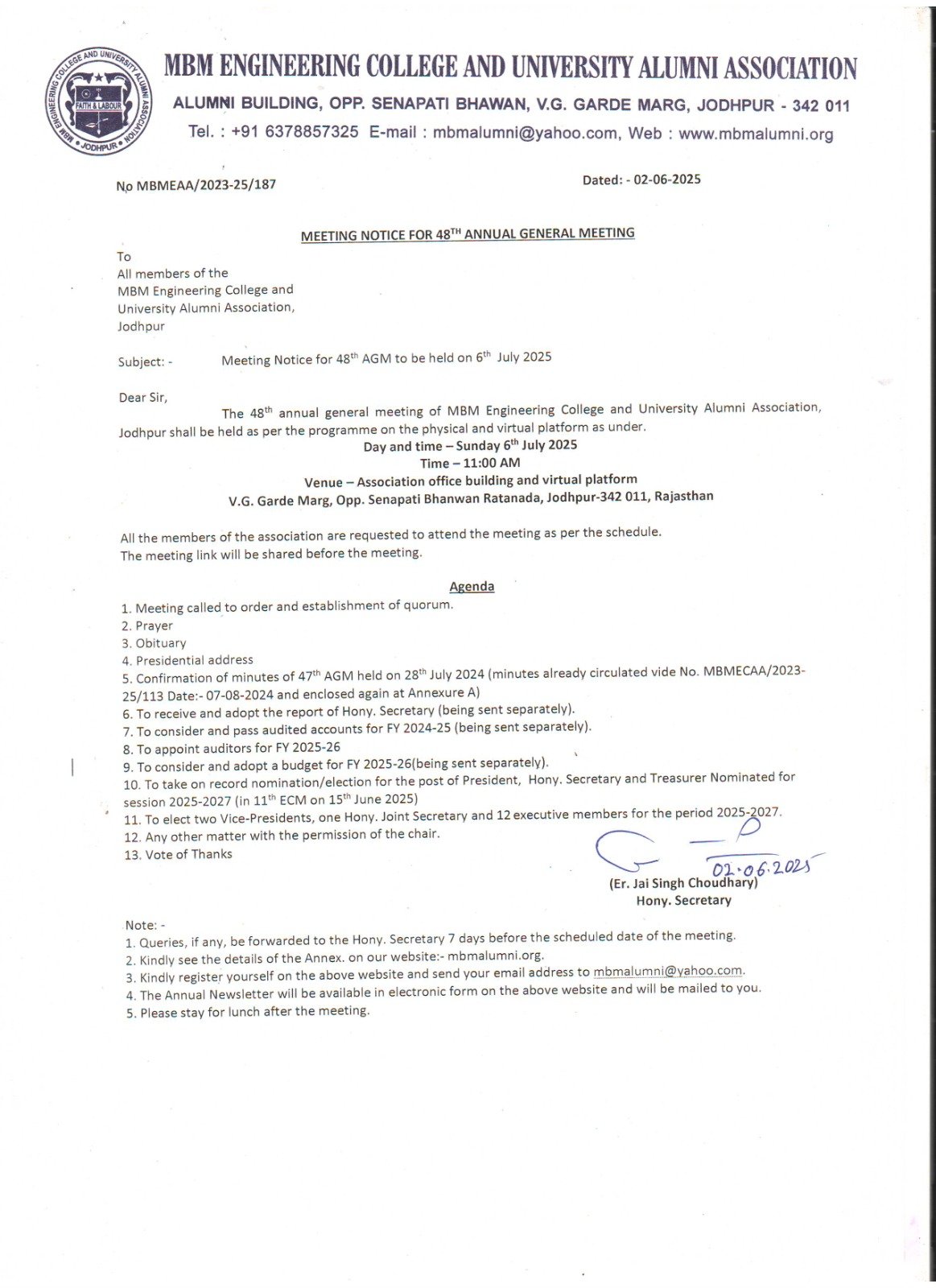 We are pleased to inform you that the 48th Annual General Meeting (AGM) of the MBM Engineering College and University Alumni Association, Jodhpur will be conducted both physically and virtually as per the following details: